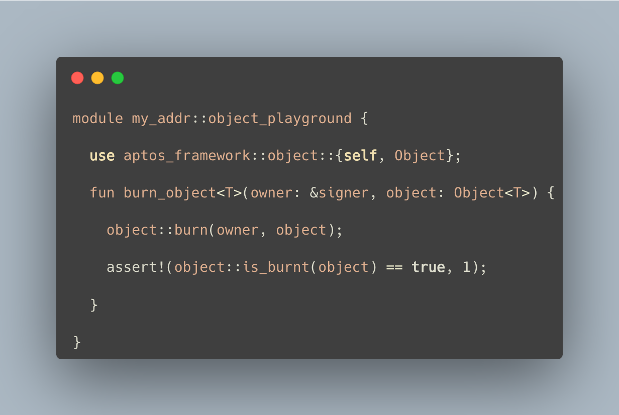 object::burn(owner, object)を使用して、オブジェクトをバーンします。object::is_burnt(object) == trueをアサートして、オブジェクトが正常にバーンされたことを確認します。
