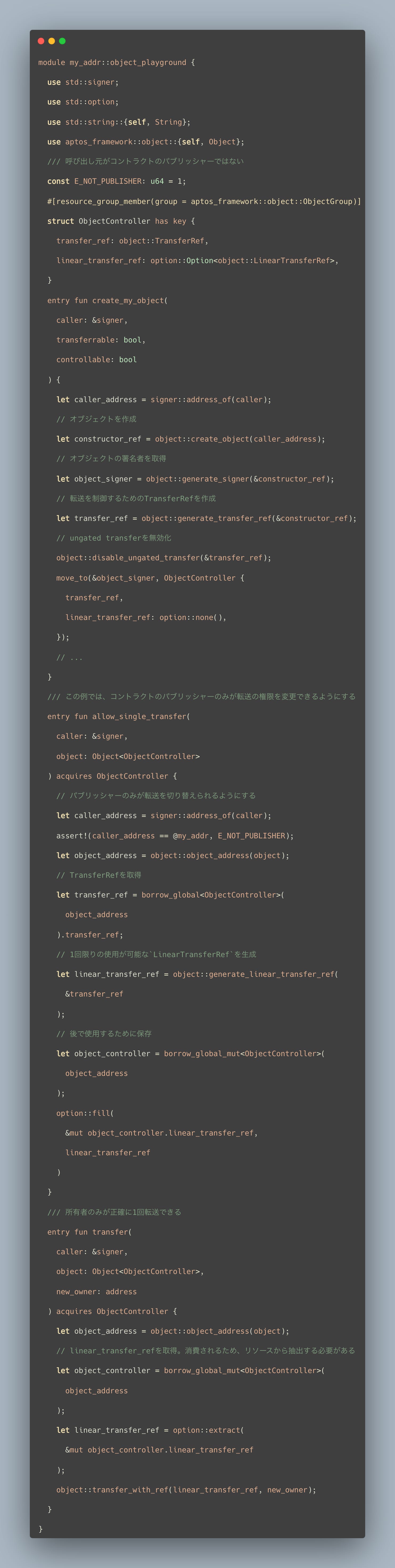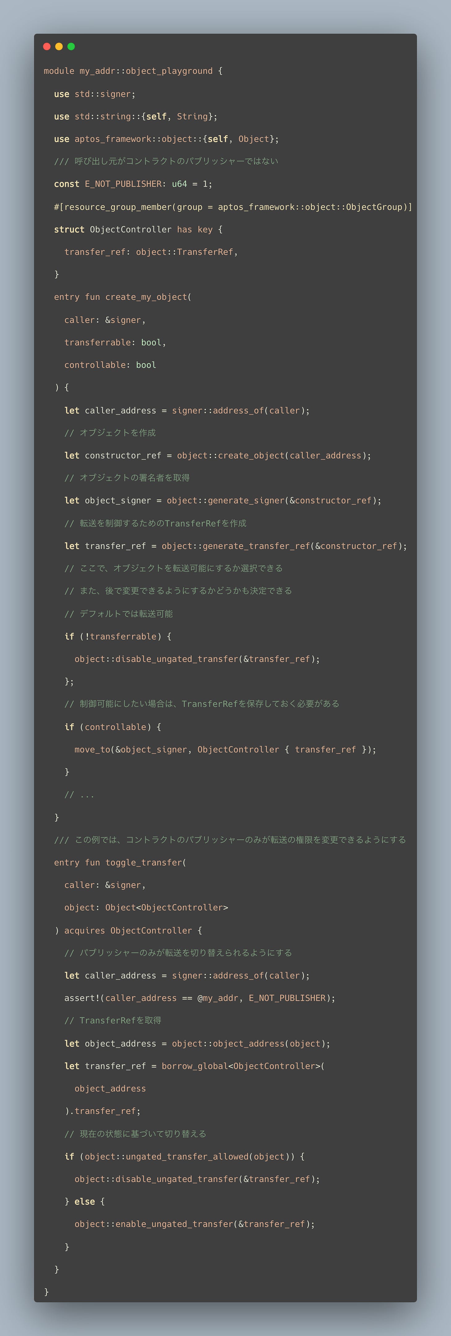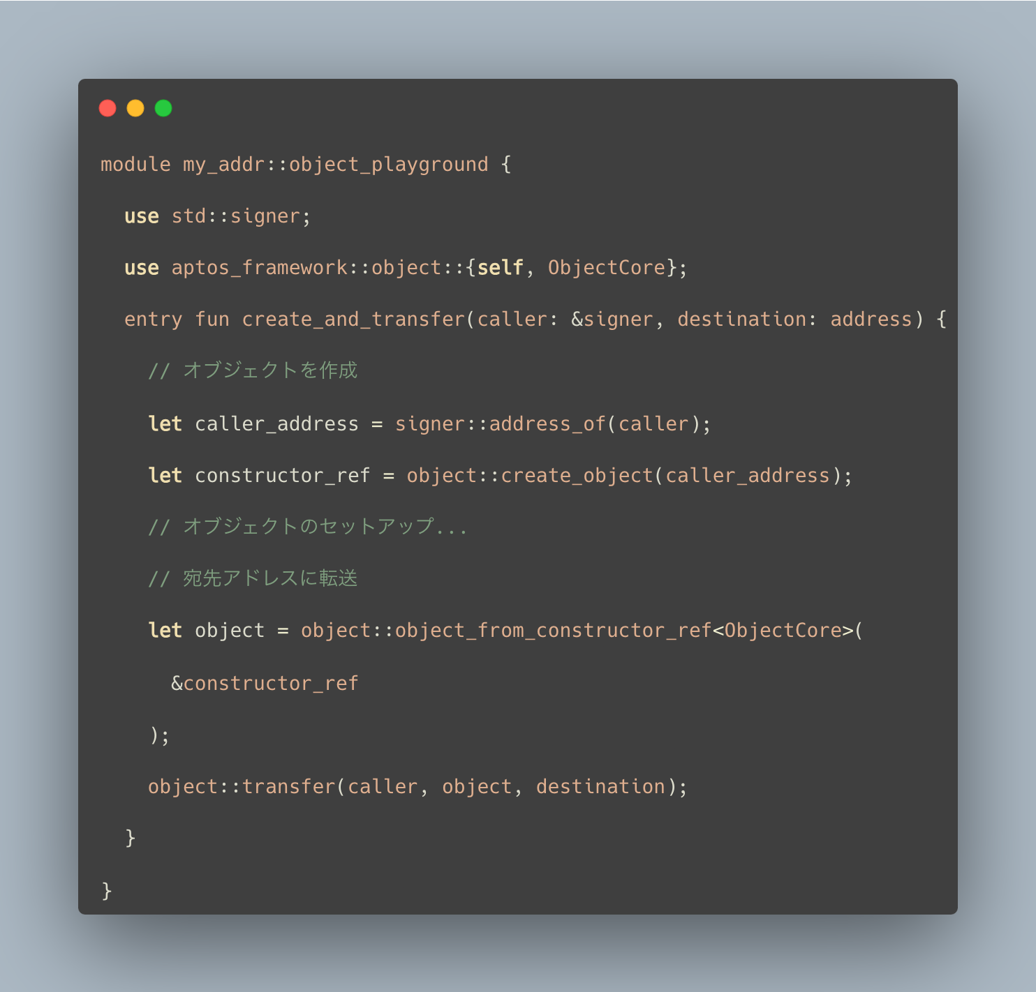 create_object関数を使ってオブジェクトを作成し、作成者のアドレスを渡す。constructor_refを使ってオブジェクトの初期設定を行う。object_from_constructor_refでオブジェクトの参照を取得。transfer関数でオブジェクトを宛先アドレスに転送。
