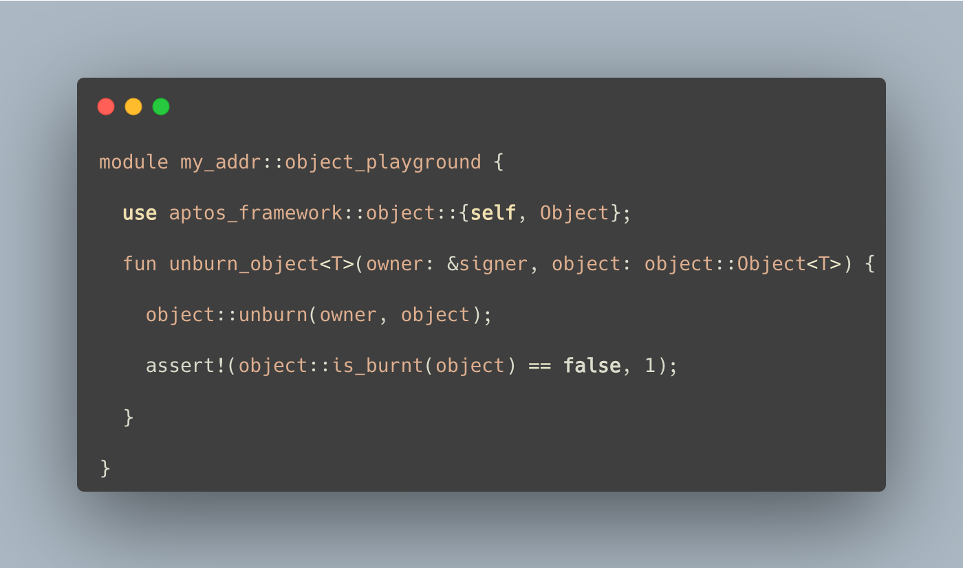 object::unburn(owner, object)を使用して、オブジェクトをアンバーンします。object::is_burnt(object) == falseをアサートして、オブジェクトが正常にアンバーンされたことを確認します。