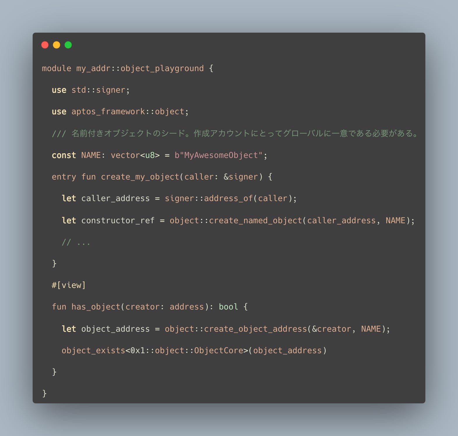 このシードは作成アカウントにとってグローバルに一意である必要がある。create_named_object関数を呼び出し、呼び出し元のアドレスとシードを渡してオブジェクトを作成。has_objectビュー関数で、特定のアドレスに名前付きオブジェクトが存在するかどうかを確認。