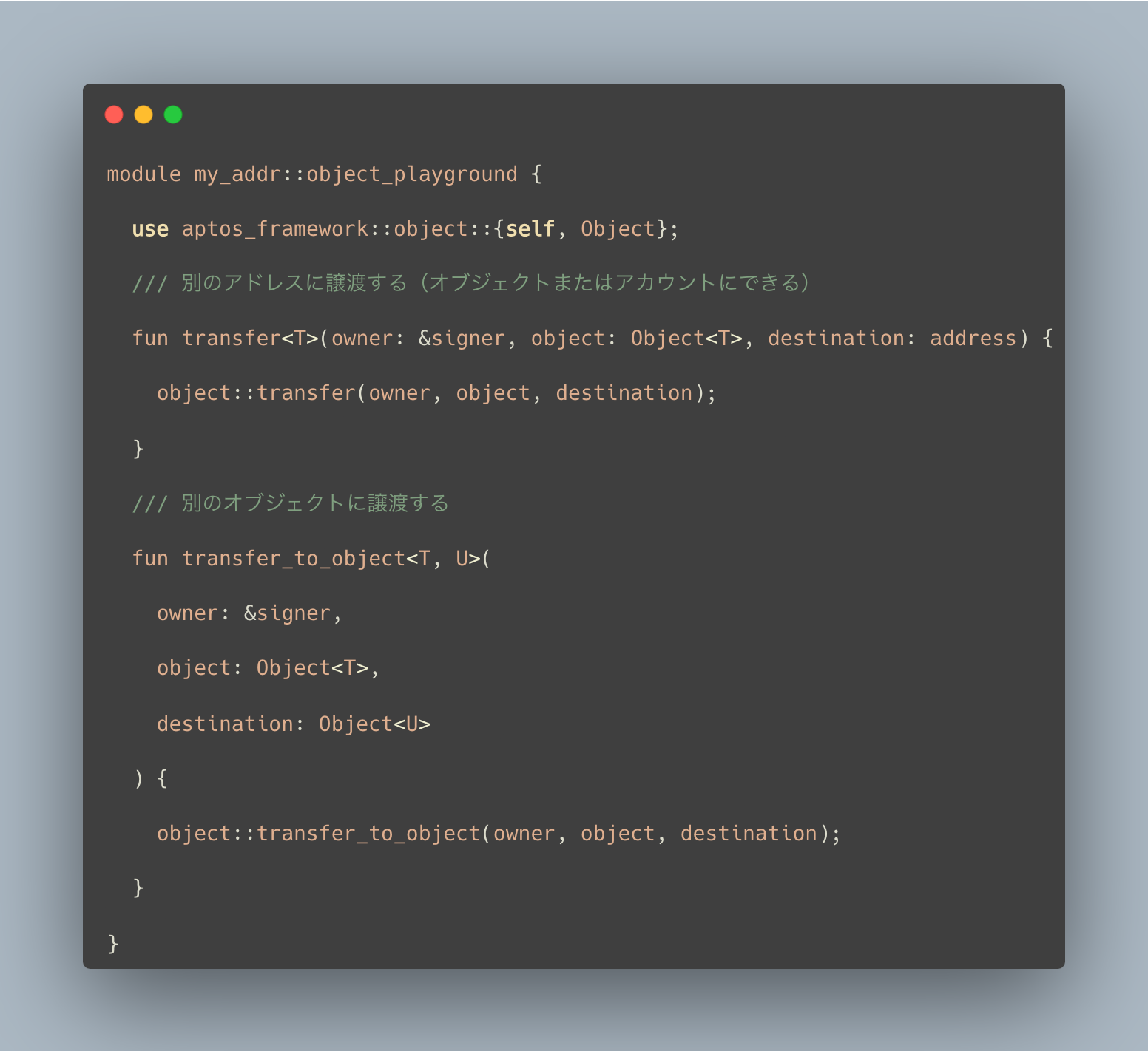 上記を使用して、オブジェクトの所有権を宛先のアドレスに譲渡します。