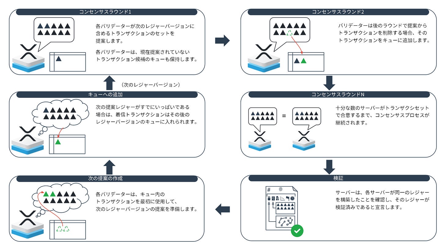 このプロセスは、新しいトランザクションが継続的に受け入れられる一方で、前のレジャーのコンセンサスプロセスが進行中に次の提案の準備が進められるため、並行して実行されます。